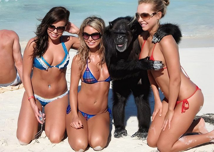 The girls, on the other hand, seem unfazed. Maybe it’s the sunshine, perhaps it’s the novelty of hanging out with a furry friend who knows no personal boundaries. Either way, the chimp’s living his best life, and frankly, the confidence is unmatched. He came for the photo op and left with a beach memory no one’s topping.